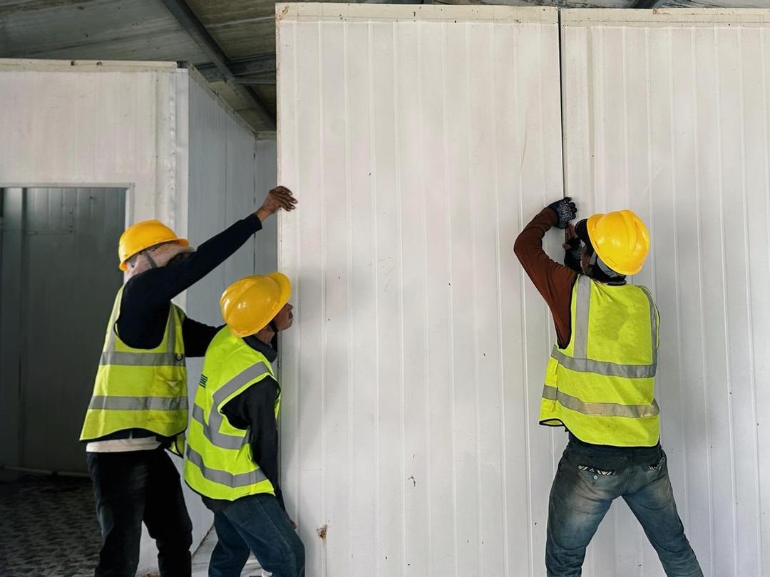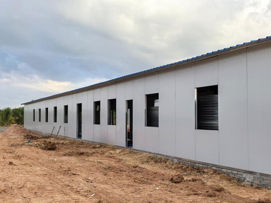 如今,我又要启程前往茶胶项目。拆板房时,韩调反复强调:“拆容易安装难,细节藏良心!慢着点,每块板都要仔细拆,新项目还能用。”到了安装环节,因为当地配件和技术有限,这群“蓝衣工作者”还总打电话回国内,咨询专业安装团队的意见,挂电话后便交代大家:“按专家建议来,宁可慢一点,也要搭得牢固安全,让大家住得放心。”